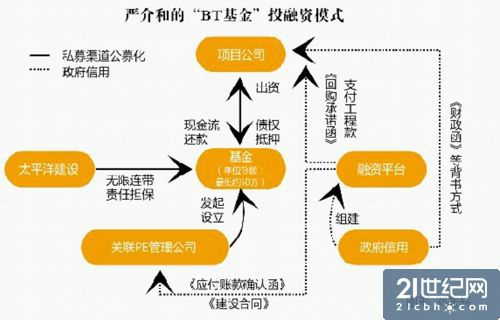但是,与此前宣称自己投身新型城镇化,将由年利率仅约3%的境外养老基金支持时不同,严现在的融资渠道几乎彻底祛魅。本报调查显示,严今年已经启动的公益性项目代建,几乎都以其自己在上海发起的一家所谓私募基金管理公司,以“应收政府债权”包装“BT私募基金”广泛募资,承诺高于10%的固定年收益率。(详见本版配图)
